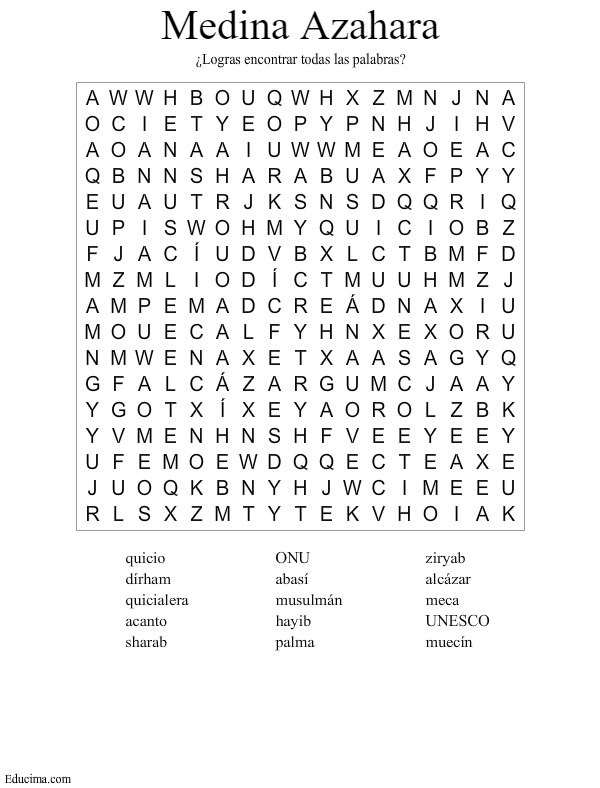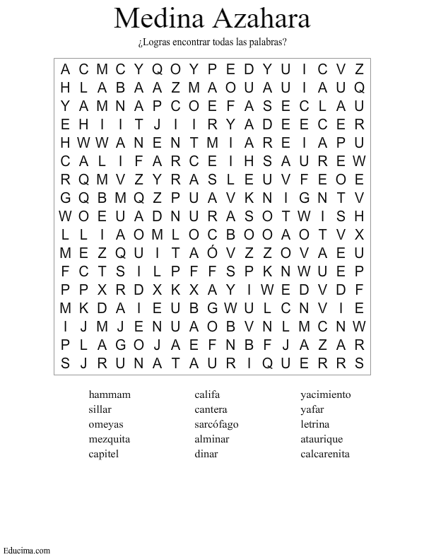 ¿Eres capaz de encontrar todas las palabras sobre Medina Azahara? En algunos te lo hemos puesto realmente difícil, así que tendrás que tener tu guía a mano para repasar las palabras que te has olvidado.